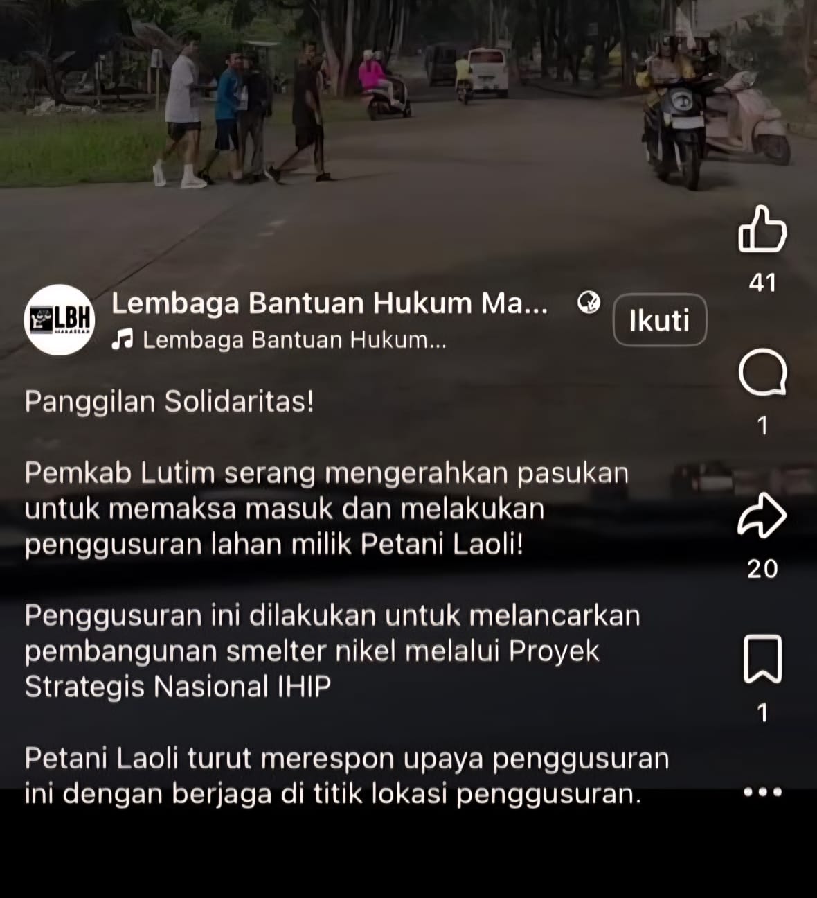 Salah satunya berasal dari akun Facebook Lembaga Bantuan Hukum Makassar – YLBHI yang membagikan video reels dengan narasi bahwa Pemkab Luwu Timur mengerahkan pasukan untuk memaksa masuk dan menggusur lahan milik petani Laoli.