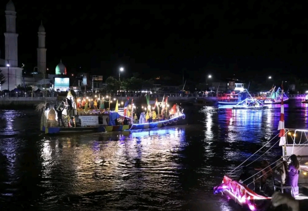 Tidak hanya sekadar hiasan, para peserta juga mengenakan pakaian adat meramaikan perahu mencuri perhatian. Sorak sorai penonton pun semakin menambah semarak suasana malam itu.