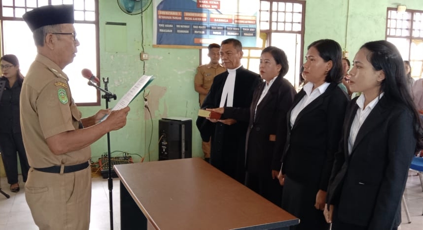 Prosesi pelantikan berlangsung khidmat di Aula Kantor Desa dan disaksikan Camat Tomoni Timur Yulius, jajaran BPD, tokoh masyarakat, tokoh agama, tokoh adat, pengurus PKK, serta masyarakat yang turut hadir memberikan dukungan.
